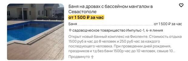Стоимость отдыха -1,5 тыс. руб. в час. А если позволяют финансы, то можно продолжить отдых, плавно перемещаясь в зону барбекю, где хороший шашлык на свежем воздухе обеспечит отличное настроение перед рабочей неделей.