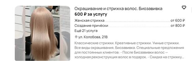 Услуги очень разнообразны: наращивание натуральных волос -5 тыс. руб., окрашивание волос- от 1 тыс. руб., афролоконы – от 2 тыс. руб., свадебный образ – от 2 тыс. руб., кератиновое выпрямление волос – от 1,5 тыс. руб., биозавивка от 3 тыс. руб. и т.д.